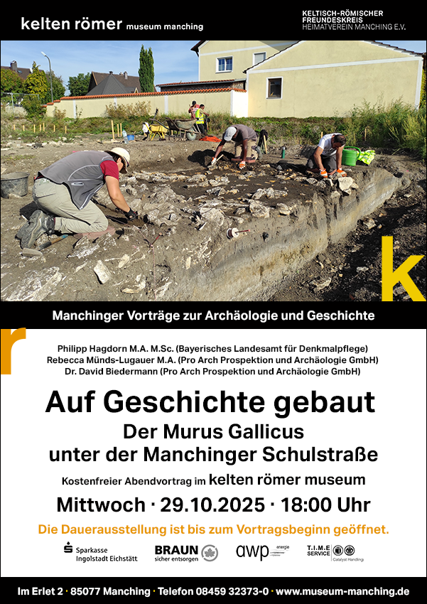 Jedes Jahr werden in Manching zahlreiche Bauvorhaben durchgeführt und meist archäologisch begleitet, so auch bei Abbrüchen von Bestandsgebäuden. Dies liegt vor allem an der Lage des Marktes auf dem Gebiet eines keltischen Oppidums – einer der bedeutendsten Ansiedlungen dieser Art nördlich der Alpen. Die Referierenden beleuchten zunächst die Bedeutung der jahrzehntelangen Forschungen in Manching, um dann die archäologischen Erkenntnismöglichkeiten am Beispiel eines größeren Projekts in der Schulstraße in den Fokus zu rücken.
